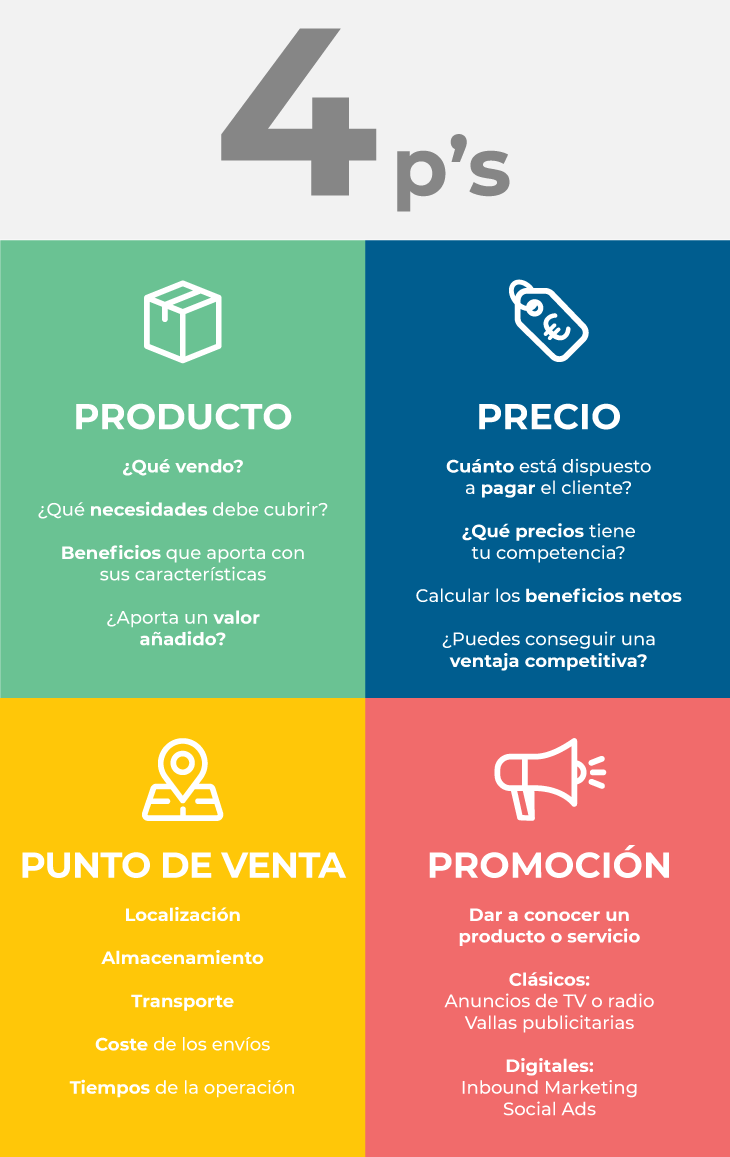 Dentro del plan de marketing, uno de los puntos más importantes a tratar es la definición de lo que podemos definir el 4 P de marketing (en la mezcla de marketing de jerga), representada por: