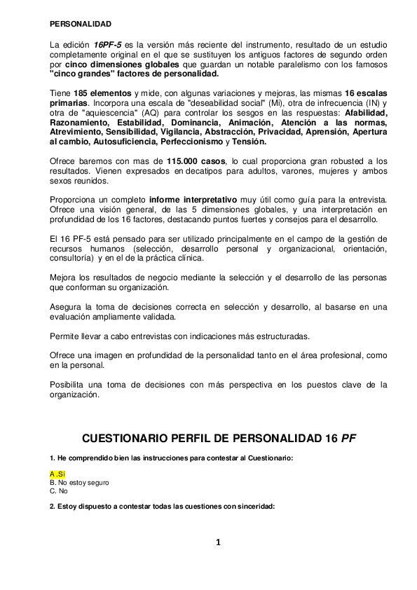 El Dr. Raymond Cattell desarrolló la prueba de factor de personalidad o 16pf después de varias décadas de investigación y desarrollo. Existen diferentes versiones del