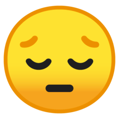 Este ícono representa una cara con los ojos cerrados y abatidos, y un ligero ceño fruncido de la boca. Este emoji podría significar lamentable, triste, lo siento o triste. A menudo se usa emoji de cara pensativa cuando le dan a alguien sus respetos al escuchar que han muerto o han tenido un favor desafortunado sobre ellos. También podría actuar como una disculpa, y podría acompañar un texto lamentable. Tiene connotaciones en gran medida negativas y se usa con frecuencia.