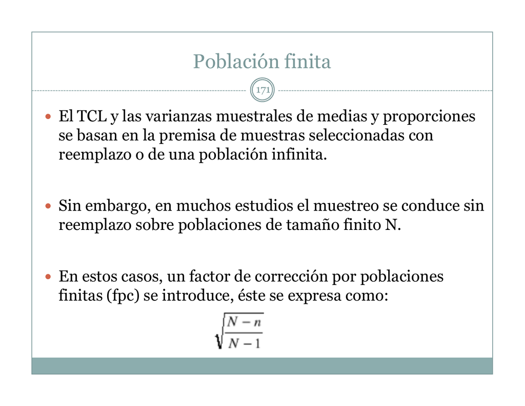 El factor de corrección de la población finito, a veces llamado factor FPC, se usa cuando el tamaño de la muestra es grande en relación con el tamaño de la población. Para la mayoría de las situaciones, la población es tan grande que los tamaños de muestra típicos son demasiado pequeños para preocuparse por la necesidad del FPC.