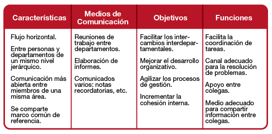 La comunicación horizontal ocurre entre las personas que tienen la misma posición jerárquica. Esta comunicación es la transmisión de información entre personas, divisiones, departamentos o unidades dentro de un nivel similar de la jerarquía organizacional. Los métodos escritos y orales se utilizan para que la comunicación horizontal sea efectiva. Ocurre entre personas que tienen la misma posición jerárquica. La comunicación horizontal a menudo se conoce como «comunicación lateral».