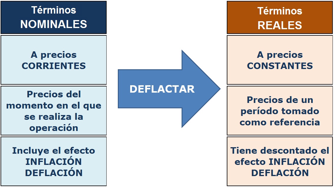 Cuando los valores nominales se refieren a los montos que se pagan (o se recogen) en términos monetarios, la corrección de los efectos inducidos por la inflación en estas cantidades conduce a la determinación del valor real o el valor en términos de poder adquisitivo de las cantidades nominales .