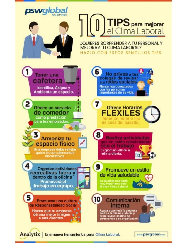 Cualquier organización desarrolla su propio clima de trabajo, a partir de los componentes físicos, sociales y funcionales en los que el individuo se baña y que influye en sus actitudes y sus comportamientos.