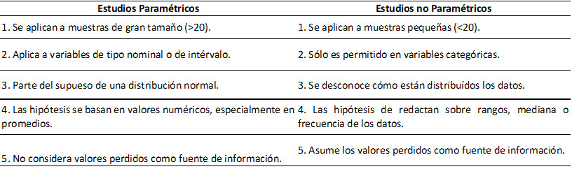 Las estadísticas inferenciales paramétricas se utilizan cuando los datos están en la escala de intervalo o relación y cuando el resultado (variable dependiente) es continua y normalmente se distribuye.
