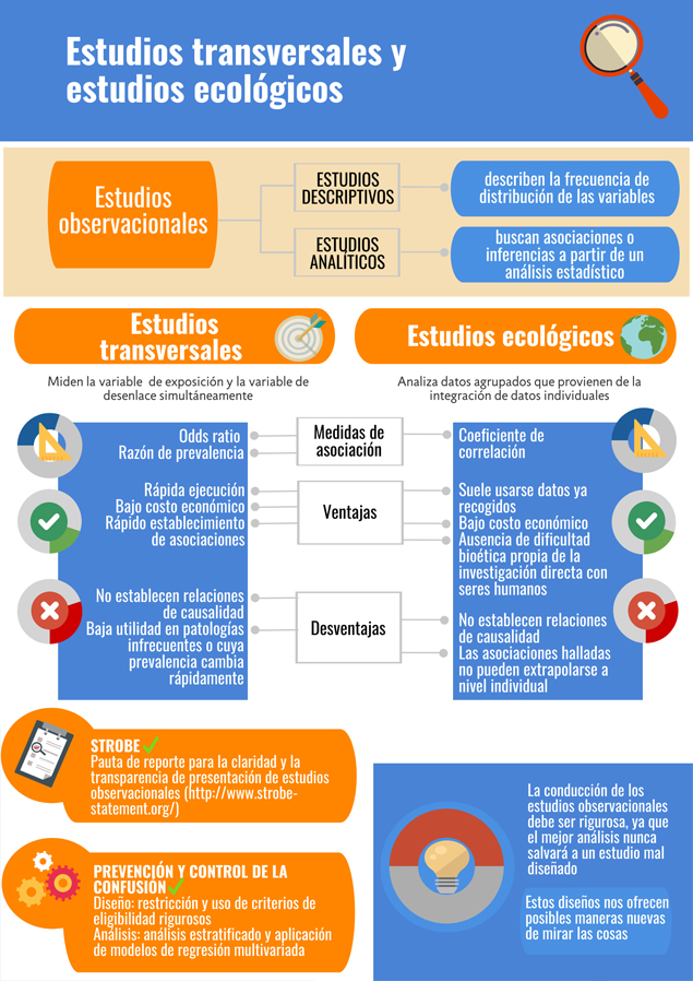 El objetivo principal de estos estudios suele ser descriptivo, pero a veces se llevan a cabo para investigar las asociaciones entre exposiciones y resultados. Los estudios transversales proporcionan una instantánea del estado de la población en un momento en el tiempo. Con este tipo de estudio, solo se puede determinar la prevalencia de las condiciones (es decir, no se puede determinar incidencia), por lo tanto, también se llaman ‘estudios de prevalencia’. Debido a que tanto la exposición como el resultado se determinan al mismo tiempo, no hay temporalidad entre estas dos variables puede ser inferida; Por lo tanto, no se pueden hacer inferencias sobre la causalidad de este tipo de diseño de estudio.