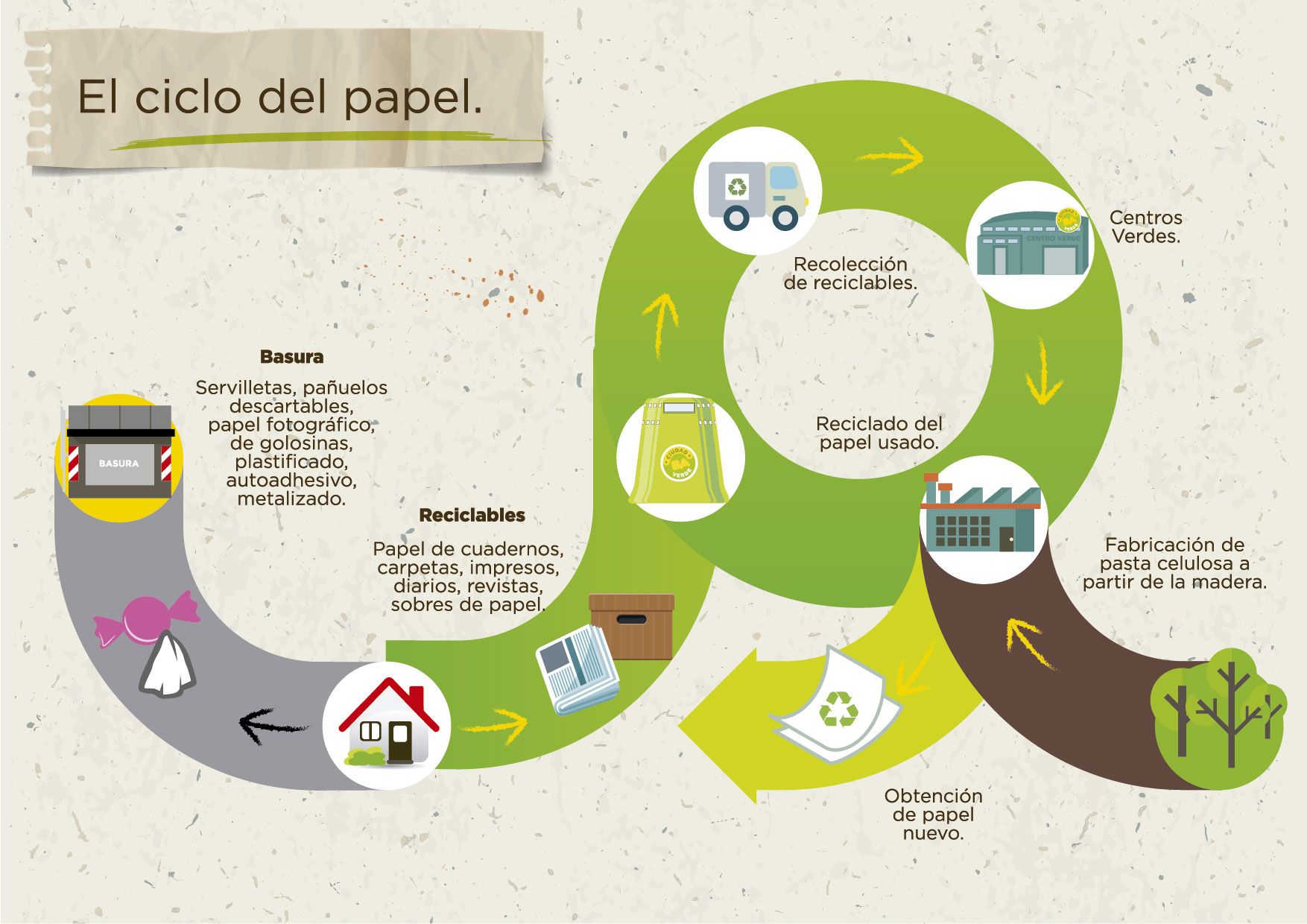 Los pasos involucrados en el ciclo de vida del papel reciclado son los siguientes.