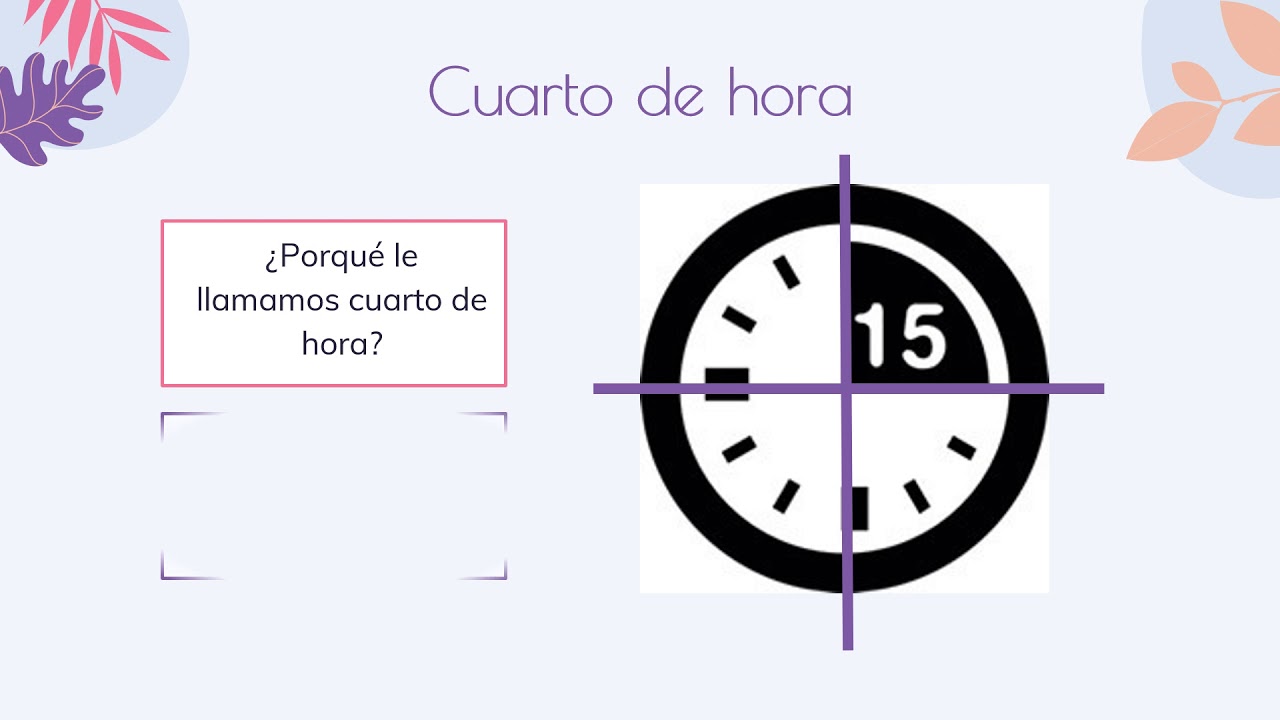 Las frases de una cuarta parte y un cuarto se usan para indicar los tiempos 15 minutos antes o después de la hora (un cuarto a tres para 2:45, un cuarto y tres para las 3:15). La hora 30 minutos después de la hora se muestra en la mitad (medio pasado de las 3:30).