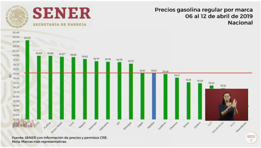 Petroleos Mexicanos de propiedad estatal (PEMEX), que posee sus propias estaciones de servicio, está en el punto medio de la lista, ofreciendo su combustible a precios muy promedio.