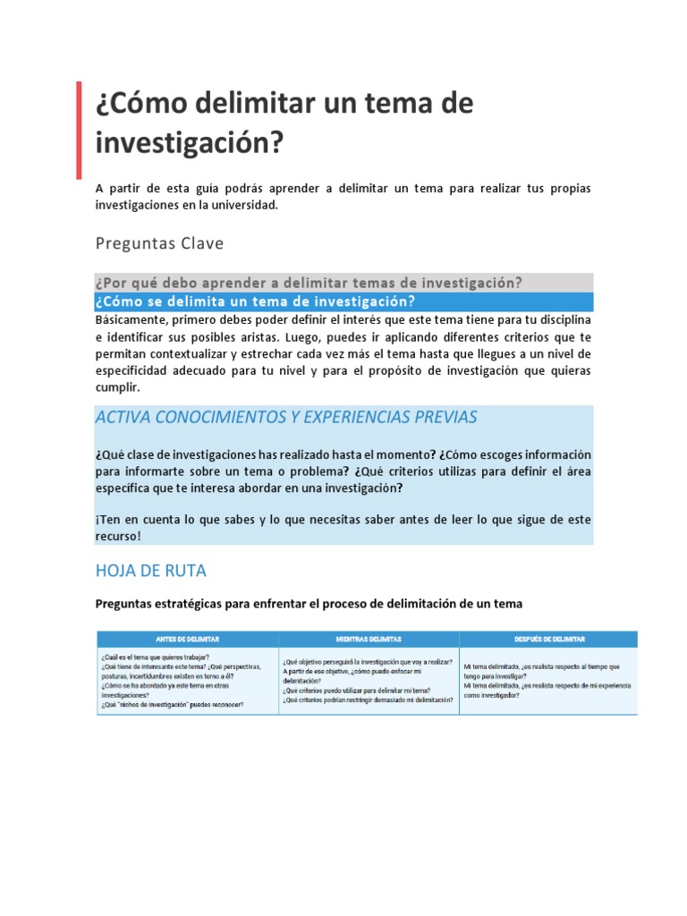 El hecho de elegir un tema implica una delimitación; Sin embargo, es necesario limitar aún más el tema para que el trabajo de investigación sea factible y el investigador tenga control sobre la información. Del mismo modo, el lector tendrá que conocer la encuesta y podrá determinar si realmente le importa.