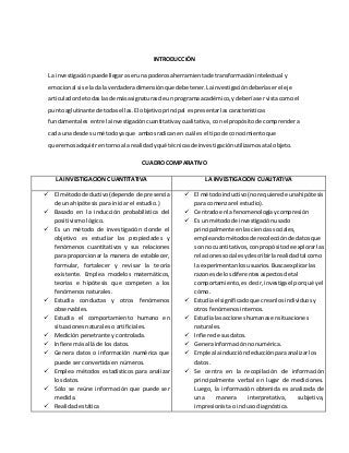 - La investigación cualitativa es exploratoria. A diferencia de la investigación cuantitativa que es concluyente.