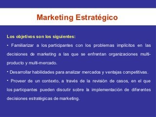 El marketing estratégico es el uso de disciplinas de marketing para lograr objetivos organizacionales desarrollando y manteniendo una ventaja competitiva sostenible. Aborda consideraciones de alto nivel, como a qué mercados, se dirigen, a qué servicios ofrecer y cómo promocionarlas y promoverlas.