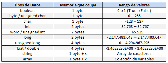 Las variables de tipo CHAR se utilizan para contener valores en los que 8 bits son suficientes como las letras del código ASCII ‘A’, ‘B’, ‘C’. Las variables de tipo int pueden contener números que no requieren una parte fraccional. Se utilizan variables flotantes y de doble tipo si se necesitan números con una parte fraccional (cifras después de la coma) o números muy grandes. La diferencia entre estos dos últimos tipos es solo en el máximo y en la menor cantidad que pueden representar. El tipo de vacío se introdujo para aumentar las posibilidades de control sobre los tipos. También hay otro tipo de datos: el bool (booleano) que puede tomar el valor 1 o 0 (verdadero o falso) ocupa solo 1 bit y a menudo se asocia con variables o condiciones lógicas.