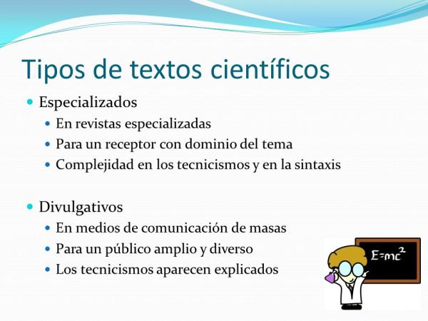 Un texto científico es aquel que difunde los resultados y los hallazgos de una investigación y representa una contribución o novedad para el sujeto. El autor debe ser un investigador que se dirige a una audiencia especializada (como la comunidad científica), para que puedan usar un lenguaje técnico y formal.