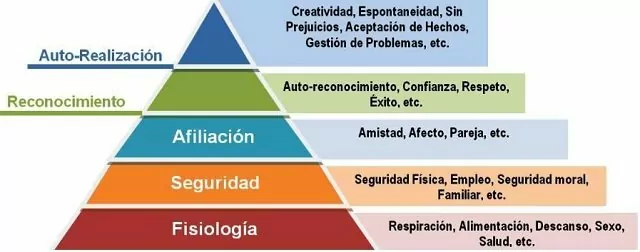 Las primeras necesidades motivacionales esenciales, según Maslow, son nuestras necesidades fisiológicas, como el aire, la comida y el agua. Una vez que nuestras necesidades fisiológicas están satisfechas, nos preocupamos por la seguridad, que incluye nuestra propia seguridad física, así como nuestra seguridad laboral. La siguiente necesidad de llenar es social: nuestra necesidad de vincularnos con otros seres humanos. La necesidad de amor, amistad y familia se considera una motivación humana fundamental. Cuando hemos logrado un sentido de pertenencia, nuestra necesidad de estima, el deseo de ser respetado por los compañeros, sentirse importantes y apreciarse, se convierte en más destacado. El nivel más alto de la jerarquía es la necesidad de la autorrealización, que se refiere a «convertirse en todo lo capaz de convertirse». [1] Las personas pueden satisfacer esta necesidad al aprender nuevas habilidades, asumir nuevos desafíos y tomar medidas para perseguir sus objetivos de vida. [2]