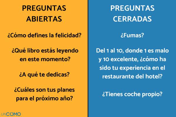 Las preguntas se pueden clasificar en dos categorías principales. Preguntas abiertas y preguntas cerradas. También se llaman preguntas abiertas y preguntas cerradas. La principal diferencia entre las preguntas abiertas y cerradas es que es probable que las preguntas abiertas reciban respuestas largas, mientras que es probable que las preguntas cerradas reciban respuestas cortas.