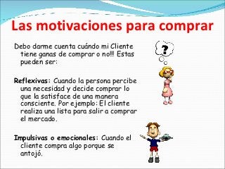 En pocas palabras, las motivaciones de compra son los factores subyacentes que se unen para influir en su cliente potencial para considerar comprar su producto o servicio. Hay una gama completa de factores racionales y emocionales detrás de las compras, por lo que es importante que identifique consideraciones en ambos espectros (fuente).